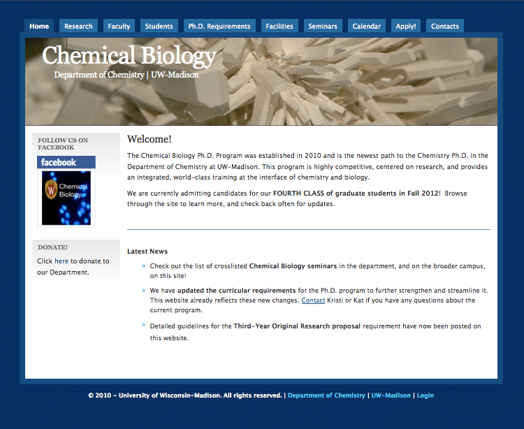 Another Drupal site I put together while I was a graduate student at UW-Madison. This was designed in 2010 for the newly formed Chemical Biology division of the chemistry department. Again, the focus was on creating a site that would be easy to maintain for future web masters (ones with no knowledge of HTML/CSS or PHP). The site still appears as I originally designed it.