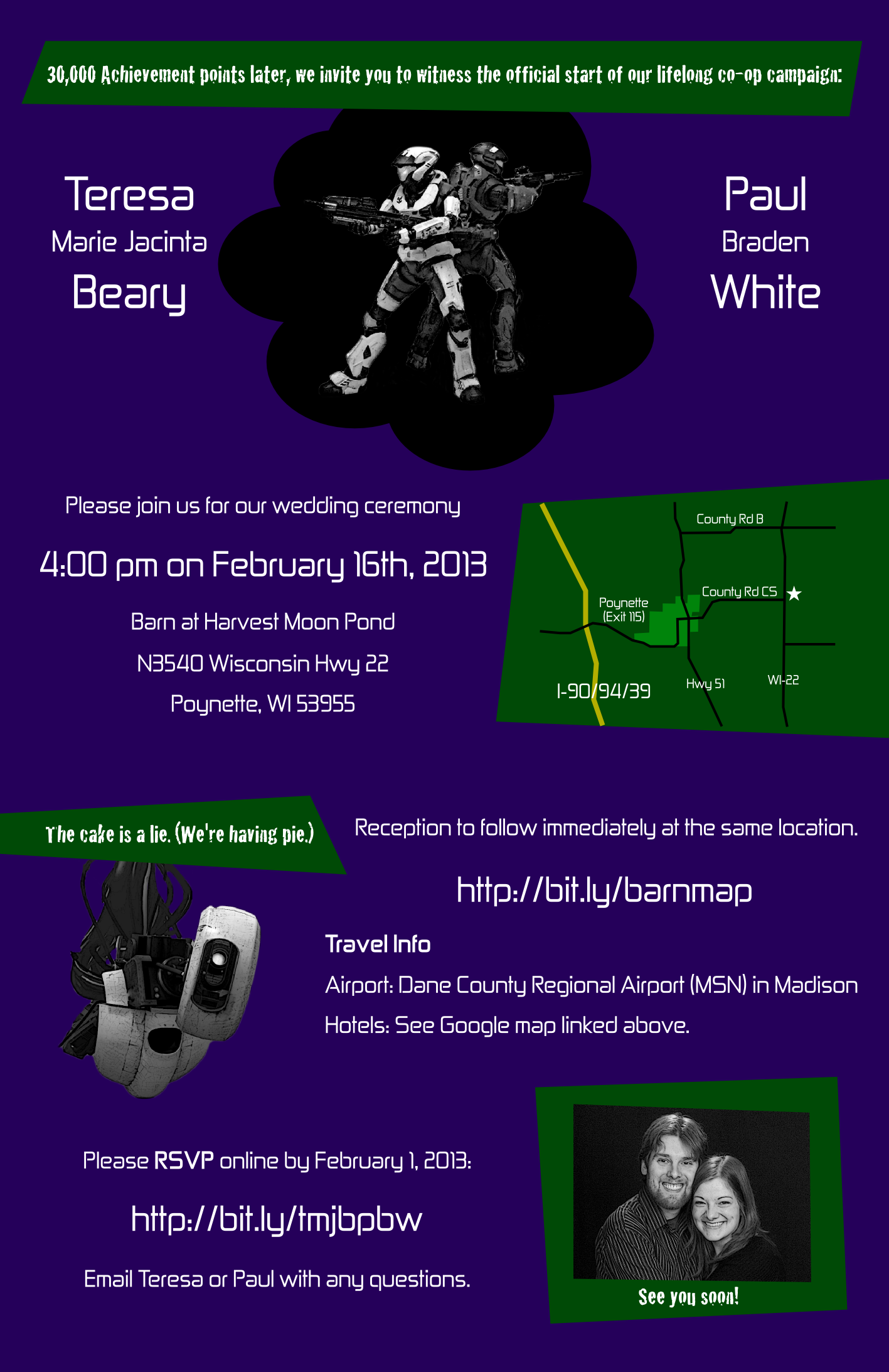 I’ve been absent from posting for a while as I prepared for my wedding (which just occurred on 2/16). I’m happy to share some of the designs I created as part of my wedding planning. My husband Paul and I share a video game hobby, so that was the theme of our reception. The first step was the invitations.