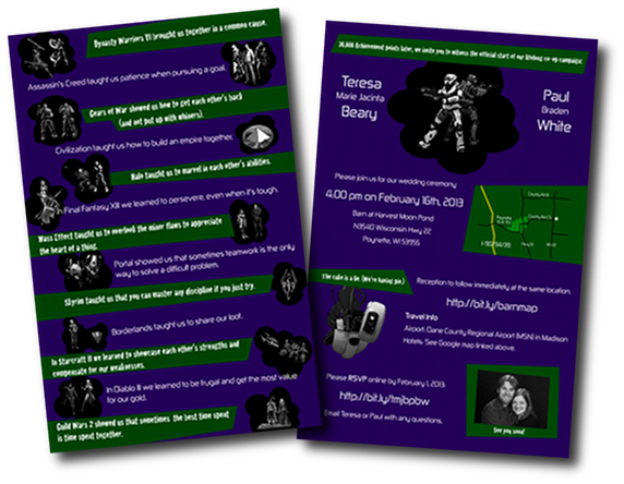 We choose 13 games that were most memorable for us as a couple and included them on the front side of the invitations with descriptions of what they signified for us. Our wedding colors were purple and green, hence the color scheme of the invites. All characters are the copyright/trademark/property of their respective studios and game companies. See the full-size front side and back side of the invitations.
